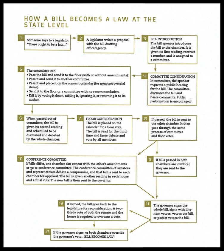 The legislative process by which a bill becomes a law is the same at the state level as it is at the federal level - however, each state can establish its own rules of procedure. The flow-chart here illustrates the evolution of a bill-to-law that takes place during a legislative session.
